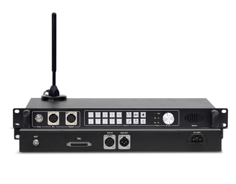 1.通話主機(jī)采用1U標(biāo)準(zhǔn)機(jī)架式設(shè)計(jì),配備揚(yáng)聲器、音量控制旋鈕、4Pin XLR頭戴耳機(jī)口、3Pin XLR麥克接口、DB 25Pin Tally輸入接口、ANT收發(fā)天線接口、AUX音頻輸入輸出和220V電源接口,主機(jī)可上機(jī)架安裝。