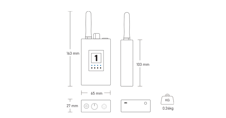 天線接口SMA-K母頭 開關(guān)及音量旋鈕 6芯mini XLR耳機(jī)接口 3.5寸LED顯示屏 狀態(tài)指示燈 分機(jī)設(shè)置按鍵 mini usb充電口 3.5 Tally輸出口 背夾 |