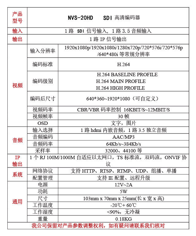 NVS-20HD高清SDI+WIFI編碼器是專業的高清音視頻編碼產品,該產品支持1路高清或1路標清SDI音視頻, 1路3.5MM獨立音頻接口采集功能,帶SDI環路輸出。編碼輸出雙碼流H.264格式,音頻MP3/AAC格式。編碼碼率可調,畫面質量可控制。支持HTTP/RTSP/RTP/RTMP/UDP等協議傳輸。使用方便,不存在硬件兼容性問題。