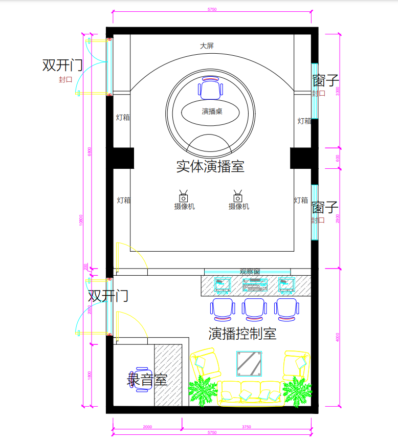 演播室的平面從整體上看是一個長方形。根據(jù)使用功能分區(qū),設(shè)計為不同的混響時間。同時,室內(nèi)局部的平行墻面之間、頂棚和地面之間還會有顫動回聲產(chǎn)生,觀眾在演播室內(nèi)也能感受到明顯的回聲。由于演播廳周圍與辦公區(qū)相連,工作時相互會產(chǎn)生很強的噪音干擾。所以如果做不好聲學(xué)裝修,會嚴(yán)重影響語言聲的清晰度和可懂度,對音樂聲也可能造成混濁,音質(zhì)效果拙劣。故將所有隔墻做高強度隔音來減少相互干擾,并利用隔墻的角度和吊頂?shù)母叨燃霸煨蛠頊p少聲學(xué)缺陷。