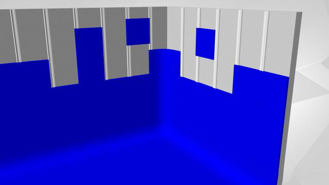 2)免漆塑料模塊拼裝表面,這種方法是在箱體部分完成后,無需弧面球面工藝,直接安裝預(yù)制的藍(lán)色綠色塑料模塊,一步到位。但是,依據(jù)光學(xué)光源發(fā)光的原理,要求預(yù)制塑料弧面和球面模塊高度和半徑大于60厘米,否則,箱角邊依然會有陰影沒達(dá)到效果,很難布光。